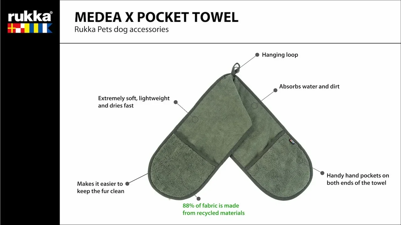 De Medea X Pocket Towel heeft aan beide uiteinden handige zakken, waardoor het afdrogen nog makkelijker wordt. De handdoek is super zacht en kan in de wasmachine worden gewassen. De handdoek wordt geleverd met een ophanglus.