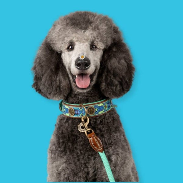 De bruin met blauwe Boho Juan is een geweldige halsband voor de kleurrijke look. De Boho collectie bestaat uit handgemaakte geborduurde en gestikte kleurrijke halsbanden. Een tijdloos design gecombineerd met de mooiste kleuren.